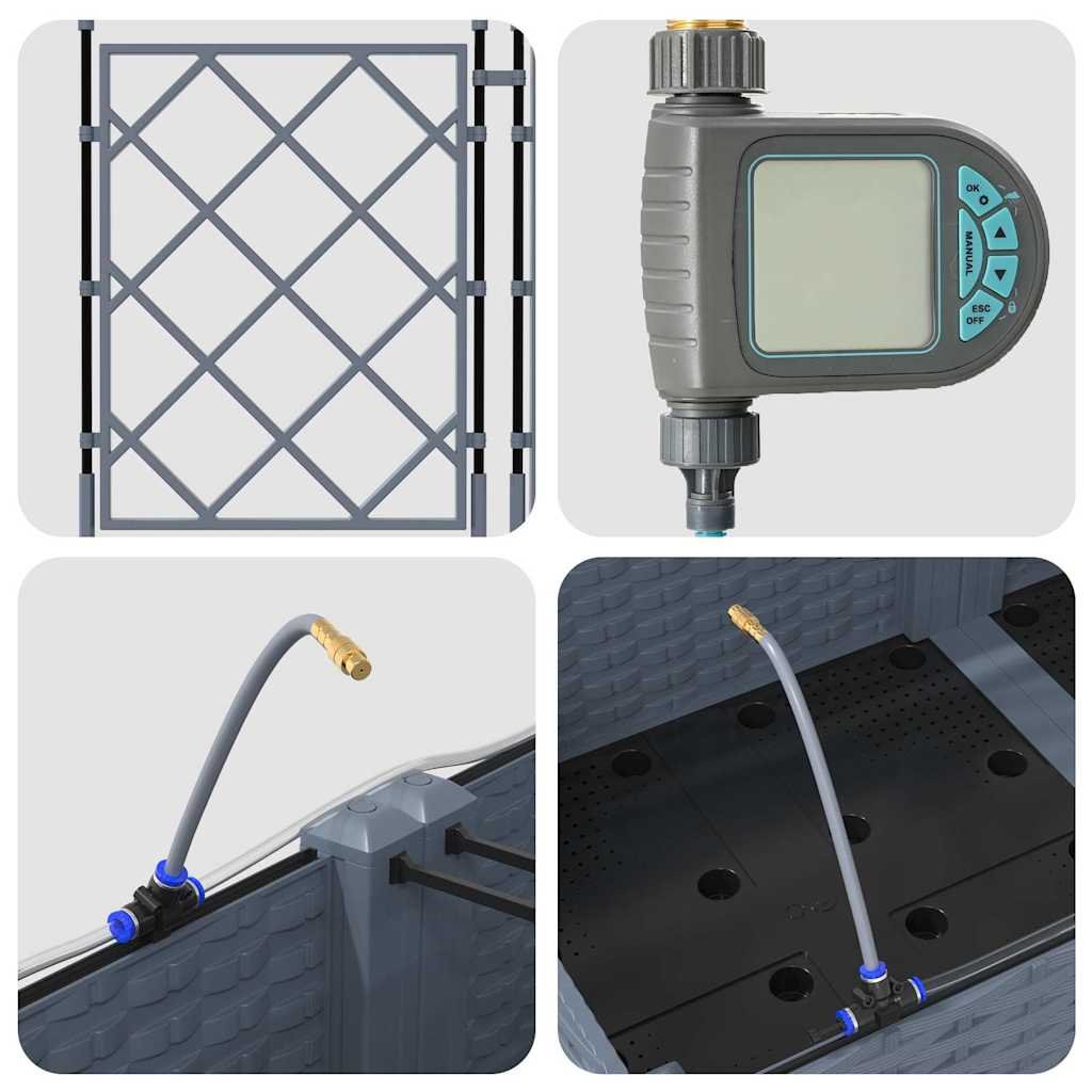 Materiál konstrukce: Zahradní květináč je vyroben z oceli odolné vůči UV záření, což zajišťuje trvanlivost a odolnost vůči povětrnostním změnám. Tato volba materiálu nabízí robustní ochranu, která vhodně odolává silnému slunečnímu záření a sezónním výkyvům, udržuje vaše rostliny naživu po celý rok bez kompromisů v strukturální integritě květináče.,Integrovaný zavlažovací systém: Tento zahradní květináč je vybaven pokročilým zavlažovacím systémem, který odstraňuje nejistotu při zalévání. Využívající integrované kanály, efektivně distribuuje vodu přímo k kořenům rostlin, což zajišťuje, že dostávají dostatečnou vlhkost, zatímco snižuje plýtvání vodou a podporuje zdravější růst.,Moderní design: Ukazuje chic tkaný vzor, elegantní jednoduchost tohoto květináče ladí s moderním estetickým pojetím. Jeho odrazivý matný povrch dodává jemný dotek, což mu umožňuje bez problémů zapadnout do různorodých venkovních prostředí i při zachování moderního stylu s čistými, decentními liniemi.,Všestranné použití: Ideální pro venkovní umístění, tento květináč má jak dekorativní, tak praktické účely. Jeho prostorný interiér pojme různé druhy rostlin, od bujných kapradin po živé květiny, což z něj činí vhodný pro sezónní přechody nebo celoroční použití, poskytující prvotřídní zkušenost s výsadbou pro koníčky i zkušené zahradníky.,Údržba a péče: Aby si zachoval svůj prvotřídní vzhled, umístěte tento květináč na stabilním místě a vyhněte se vystavení přímému slunečnímu záření po delší dobu. Pravidelně čistěte suchým hadříkem a zajišťujte spojení při sestavování, aby se zaručila stabilita a estetická hodnota v průběhu času.- Barva: Světle šedá