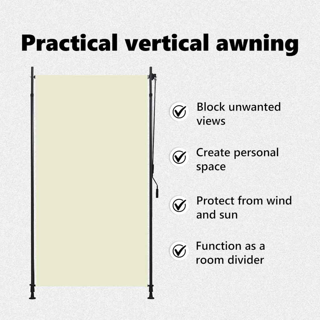 Je vyrobená z kvalitní látky s vrstvou PA, takže nebledne a skvěle blokuje sluneční záření, aniž by zamezovala proudění vzduchu. Ke snadnému stahování a vytahování slouží ruční klika. Tuto vertikální markýzu obdržíte se dvěma stojacími sloupky, jejichž výšku si můžete sami nastavit v rozmezí od 2 do 3 m. Vejde se tedy pod většinu zastropení a velice jednoduše se instaluje.