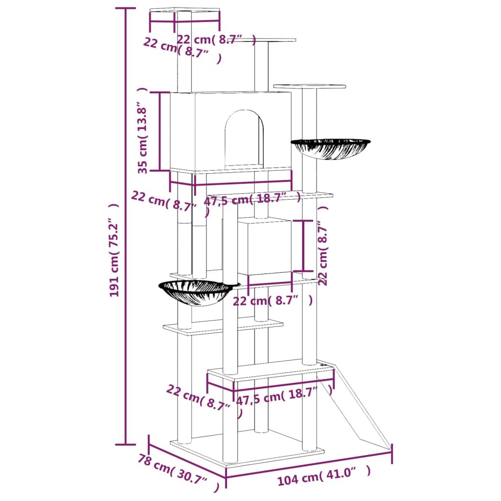 - Všestranná kočičí věž: Víceúrovňová škrabací věž pro kočky poskytuje kočce zábavu a kompaktní místo na hraní a dovádění a teplý pelíšek pro klidné zdřímnutí. Disponuje žebříkem, 2 domečky, 2 hamakami a plošinami.