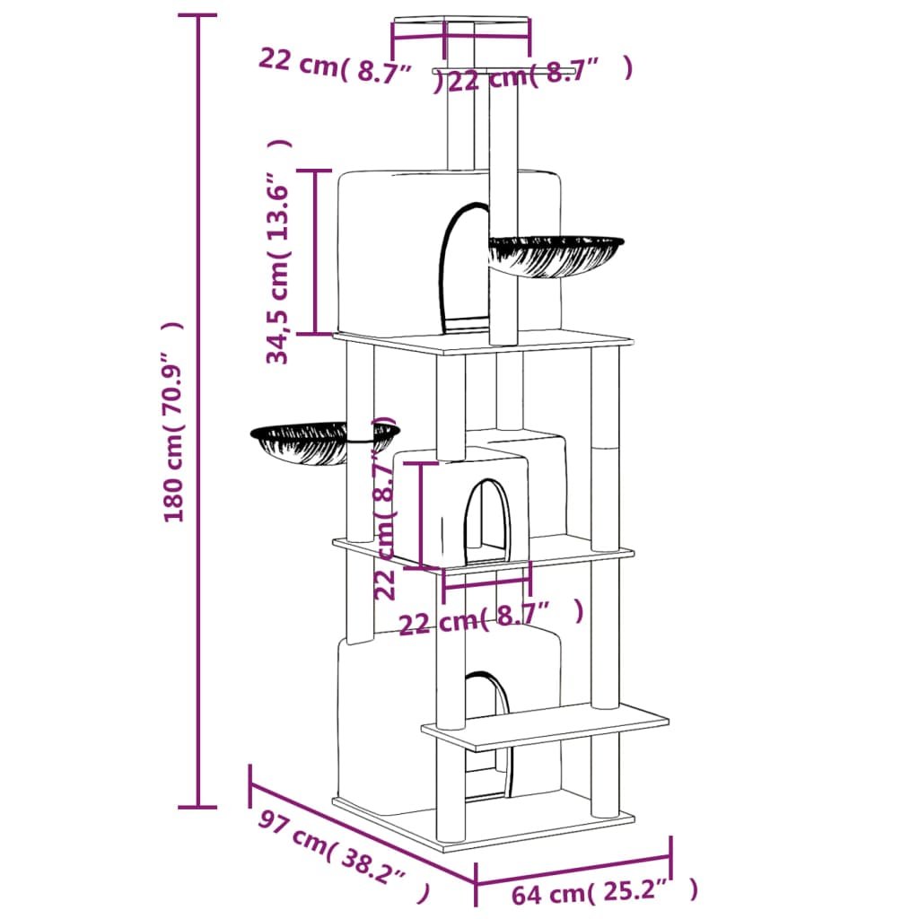 - Všestranná věž pro kočky: Víceúrovňový nábytek pro kočky je navržen se 4 domečky, 2 hamakami a plošinami, které poskytují kočkám ideální místo pro šplhání, sezení, škrábání, schovávání se a také k odpočinku.