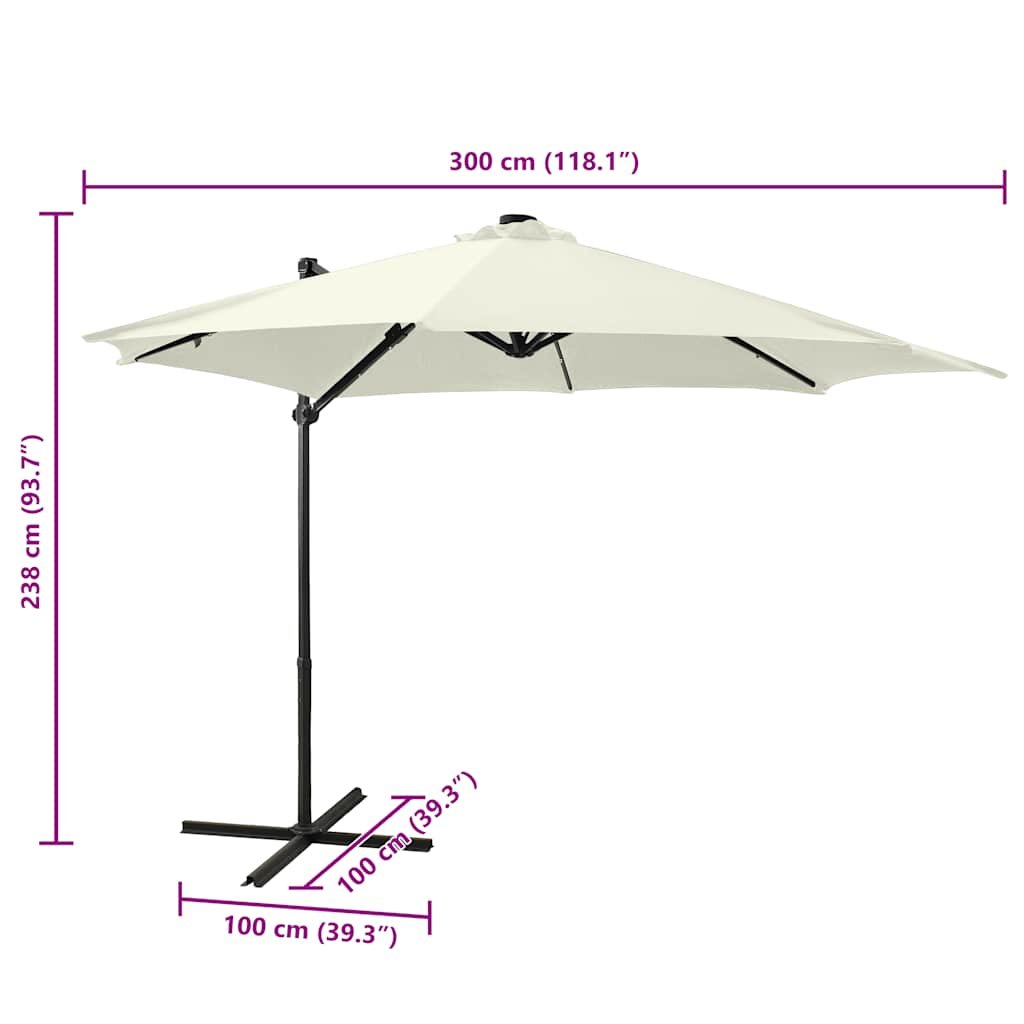 Tento elegantní boční zahradní slunečník s LED světly je skvělou volbou, která vám poskytne stín, a ochrání vás tak před sluníčkem a jeho škodlivým UV zářením. Když zapadne slunce, LED diody osvětlí váš venkovní prostor.