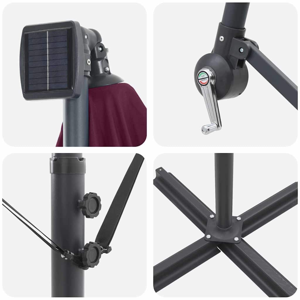 - Součásti: Obsahuje ruční kličku pro jednoduché otevírání a zavírání, naklápěcí mechanismus pro šikmé stínění a solární LED světla, suitable for co rozjasní vaše večery bez nákladů na energii.