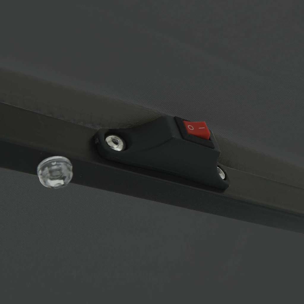 - Integrovaná LED světla: Pro přidanou atmosféru během večerních setkání slunečník obsahuje flexibilní LED pásková světla. Tato pásková světla lze snadno připevnit a poskytují jemné, příjemné osvětlení, které zvýrazní jakoukoliv noční zahradní párty nebo intimní večeři. Toto vestavěné osvětlení je praktické a eliminuje potřebu dalšího venkovního osvětlení.