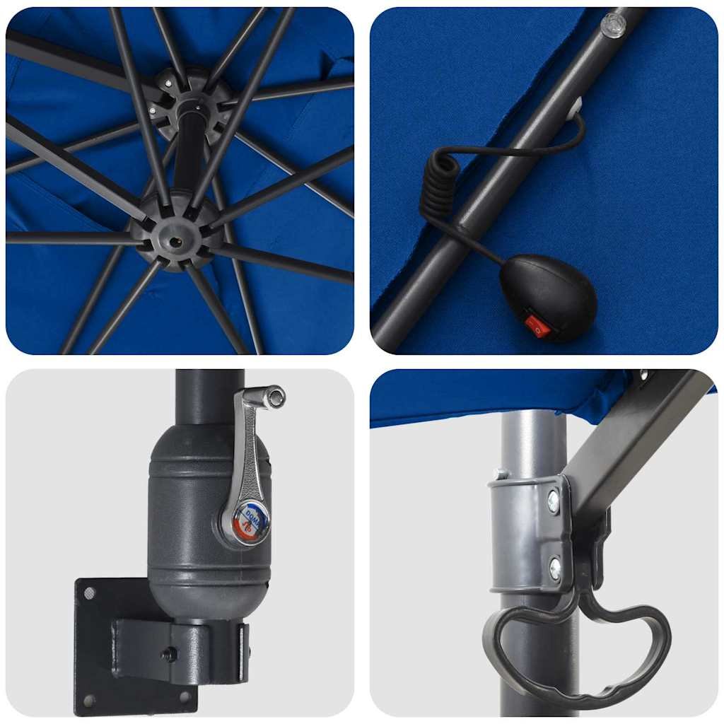 - LED osvětlení: Slunečník má schovaná LED světla pod baldachýnem, skvělá pro příjemné světlo, když si užíváš večer. Jsou solární nebo na baterie, takže žádné nepořádné kabely.