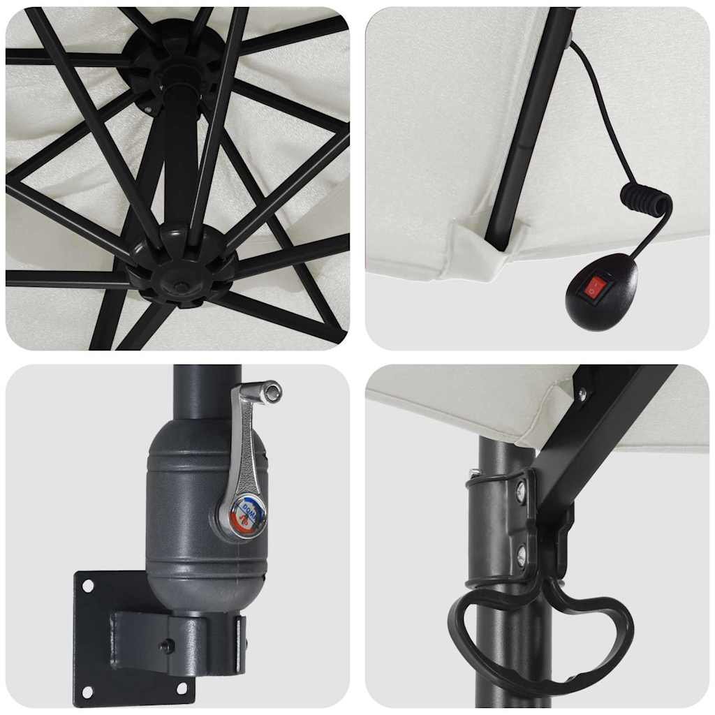 - LED Pásky Osvětlete své večerní setkání integrovanými flexibilními LED pásky. Navržené k tomu, aby se jednoduše uchytily přes žebra slunečníku, tyto světla vytvářejí okouzlující atmosféru ideální pro noční relaxaci nebo zábavu hostů ve vašich venkovních prostorách.