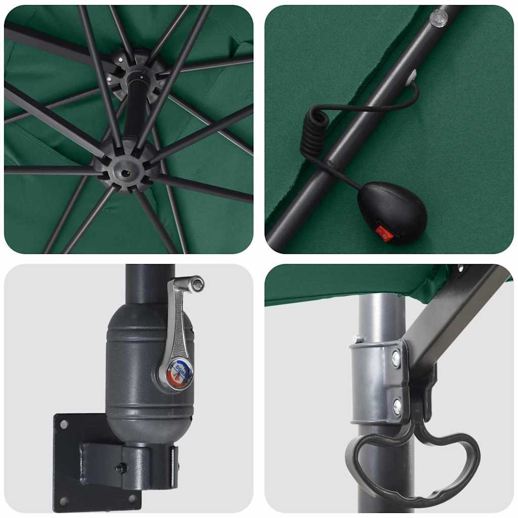 - LED osvětlení: Slunečník má schovaná LED světla pod baldachýnem, skvělá pro příjemné světlo, když si užíváš večer. Jsou solární nebo na baterie, takže žádné nepořádné kabely.
