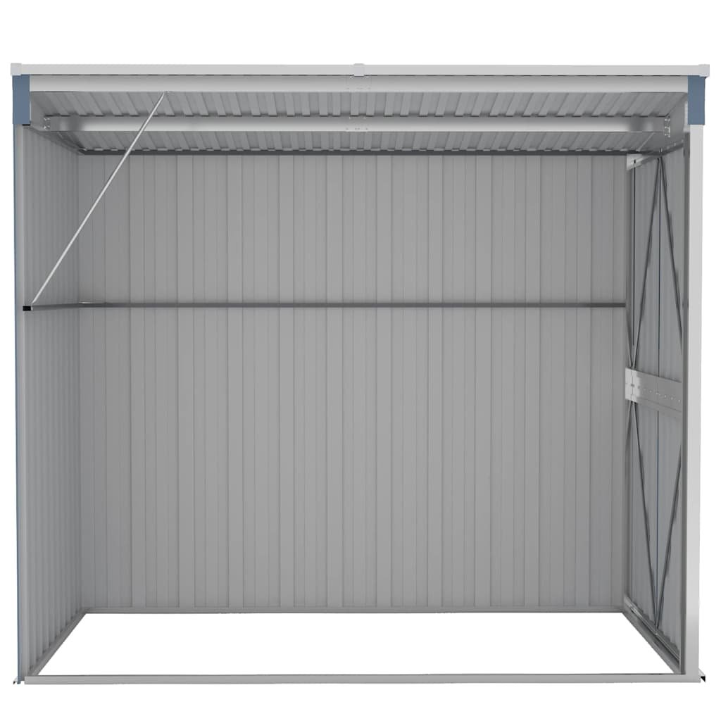 Díky tomu, že je vyroben z pozinkované oceli a kovu, vyžaduje sklad minimální údržbu a je velmi odolný. Dvojité otevírací dveře v přední části umožňují snadný vstup a výstup. Plastová rukojeť s funkcí zámku zajišťuje bezpečnost vašich věcí. Navíc dešťová voda automaticky odtéká ze střechy díky šikmé konstrukci.