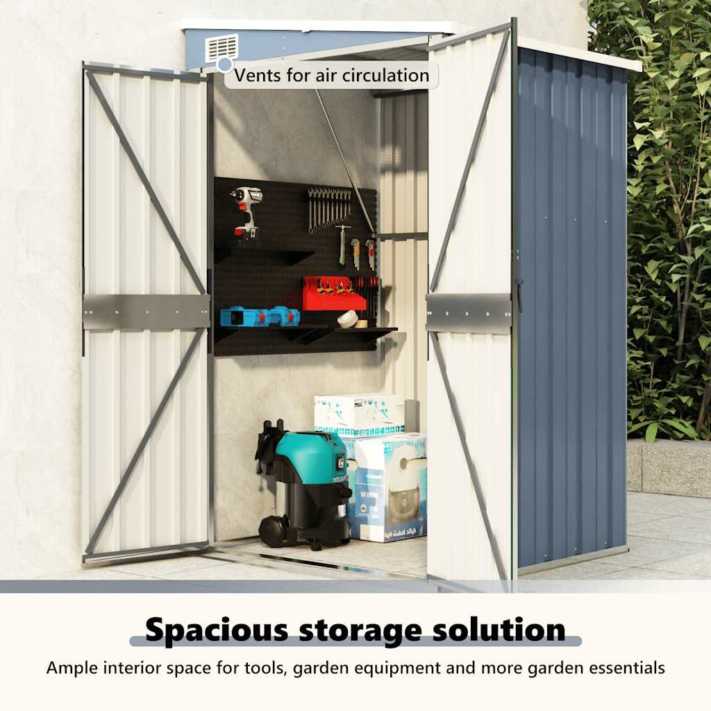 Díky tomu, že je vyroben z pozinkované oceli a kovu, vyžaduje sklad minimální údržbu a je velmi odolný. Dvojité otevírací dveře v přední části umožňují snadný vstup a výstup. Plastová rukojeť s funkcí zámku zajišťuje bezpečnost vašich věcí. Navíc dešťová voda automaticky odtéká ze střechy díky šikmé konstrukci.