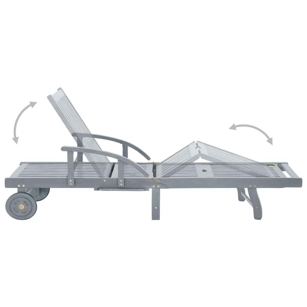 Toto zahradní lehátko je vyrobené z masivního akáciového dřeva s šedou povrchovou úpravou, takže je robustní a stabilní. Opěrky zad a nohou jsou polohovatelné a můžete je snadno nastavit do požadované polohy. Toto zahradní lehátko se 2 kolečky snadno přemístíte, kamkoliv potřebujete. Lehátko je vybavené praktickým výsuvným stolkem, na který můžete položit telefon, sluneční brýle, pití a další drobné předměty. Polštářek přispívá k optimálnímu komfortu během vaší relaxace. Každá poduška je vybavená dvěma páry šňůrek, abyste ji mohli pevně zafixovat k lehátku.