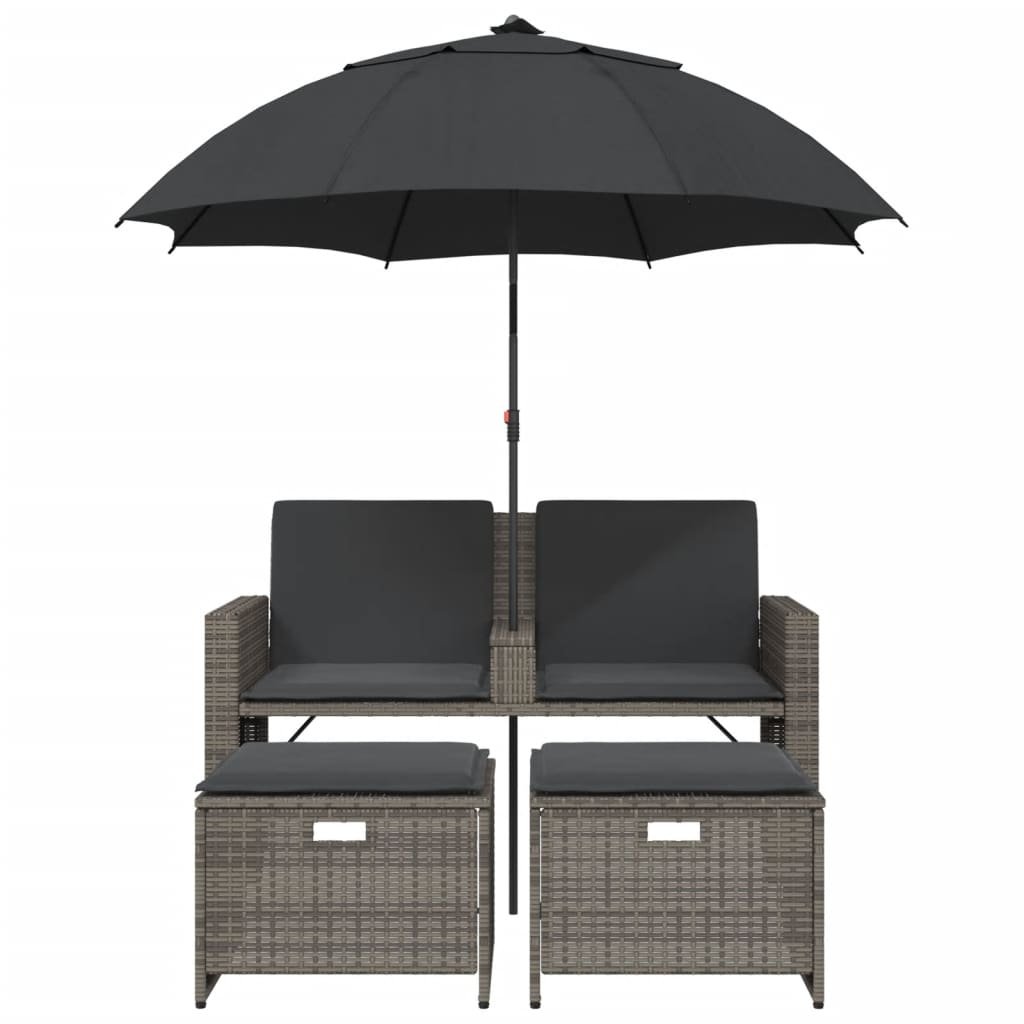 Zahradní pohovka 2místná slunečník a taburety šedá polyratan 365885